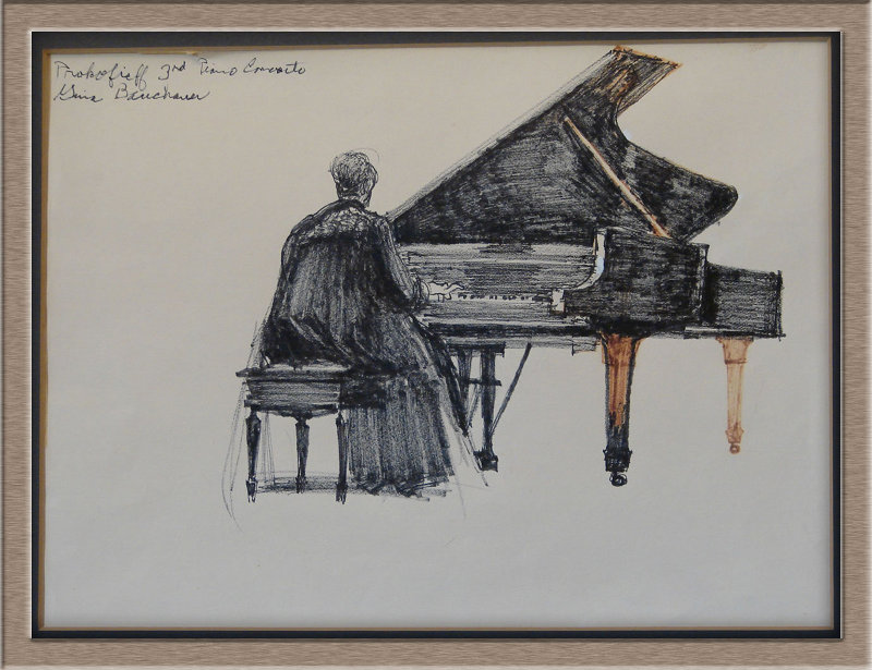 Pianist Gina Bauchauer was born in Athens, Greece in 1913 and died in 1976. She performed extensively in the United States and Europe and did many concerts for the troops in WWII. Fresno artist Rollin Pickford drew her performing Prokofieff's 3rd piano concerto and presented it to the FFCF. |